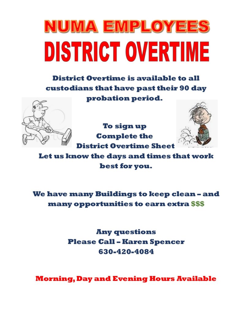Have you signed up for district overtime yet? With the current lack of subs, there is a pretty consistent need for coverage across our 23 worksites on all shifts (especially during lunch!)…You can sign up month to month or for the entire school year, just fill out this form and send it to Karen Spencer at the stadium via email or interschool mail.